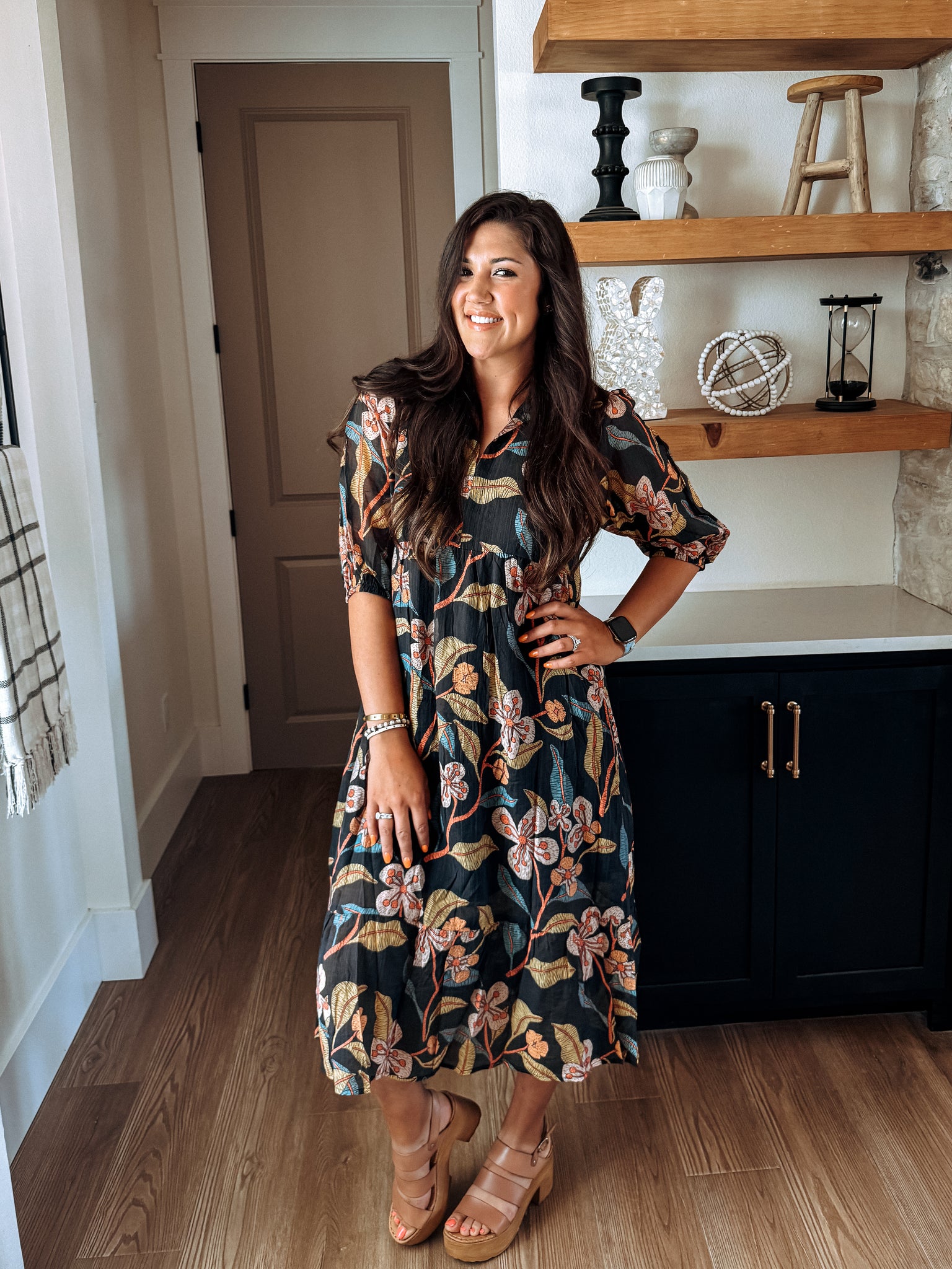 Mixed Floral Print Tiered Midi DressMidi with Tiered Hem