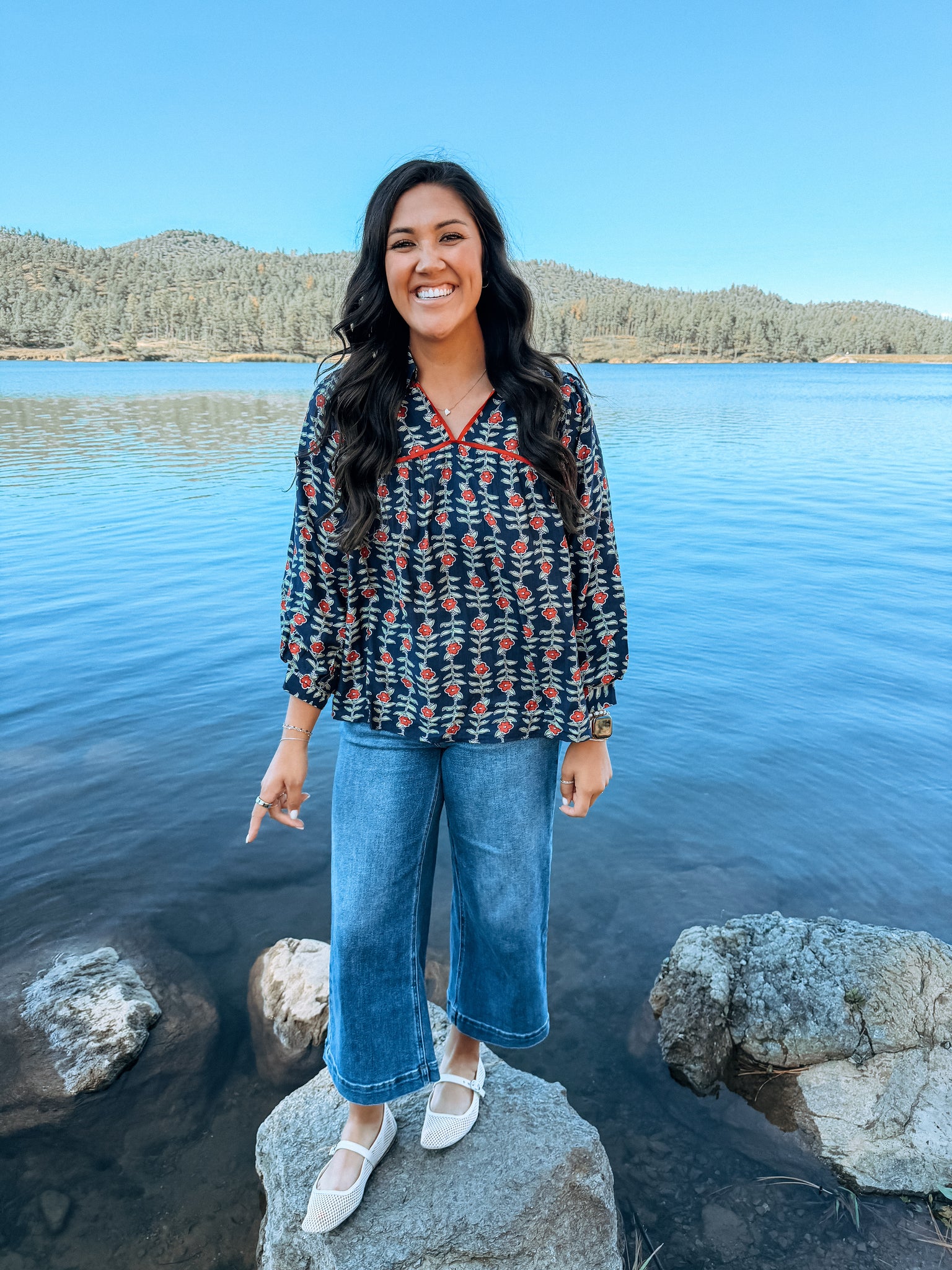 Navy Blouse with Floral Print